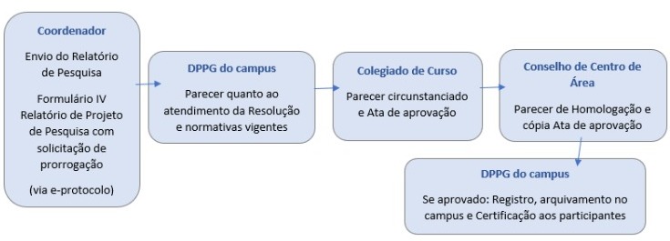 1) Para envio da solicitação de prorrogação de vigência da Pesquisa, o coordenador deve apresentar a solicitação, no formulário de Relatório de Pesquisa (Formulário IV – Relatório de Projeto de Pesquisa), indicando a solicitação de prorrogação com justificativa fundamentada;