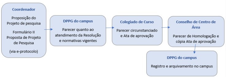 1) Para proposição de Projeto de Pesquisa, o coordenador deve apresentar a solicitação de aprovação, conforme formulário de Projeto de Pesquisa (Formulário II – Proposta de Projeto de Pesquisa)