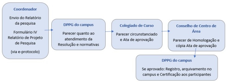 1) Para envio do Relatório Final de Atividades da Pesquisa, o coordenador deve apresentar a solicitação, conforme formulário de Relatório de Projeto Pesquisa (Formulário IV – Relatório de Projeto de Pesquisa);