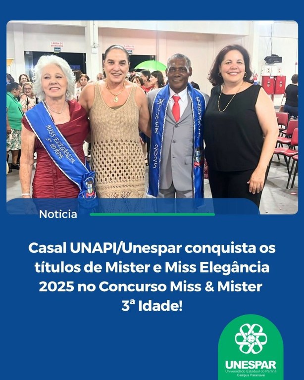 • Casal UNAPI/Unespar conquista os títulos de Mister e Miss Elegância 2025 no Concurso Miss & Mister 3ª Idade!