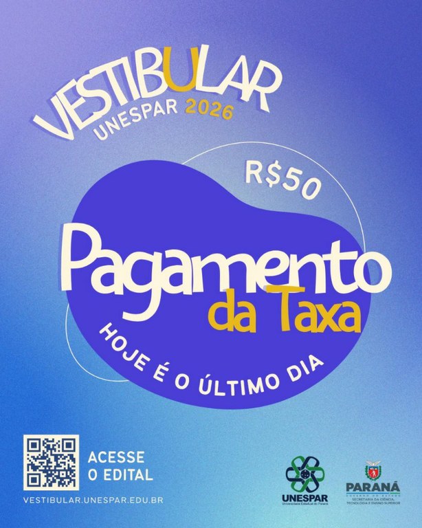 • Hoje é o último dia para pagar a taxa de inscrição do Vestibular Unespar 2026.