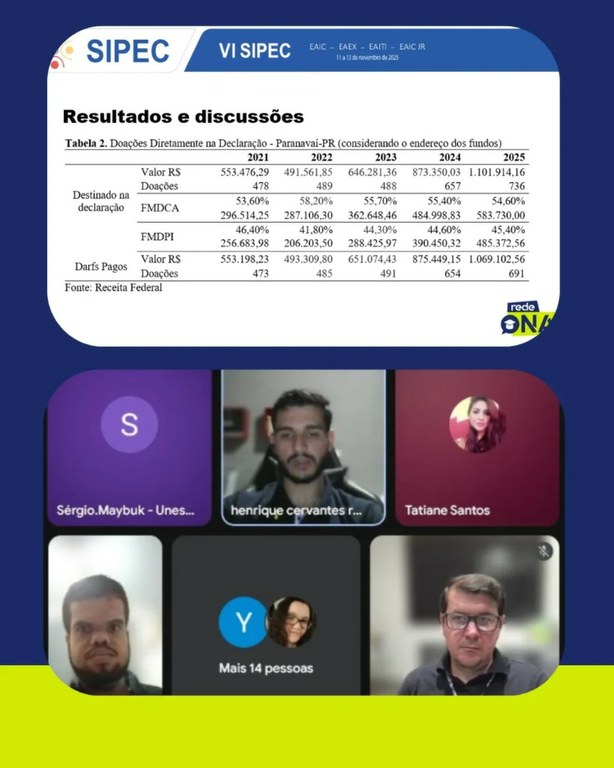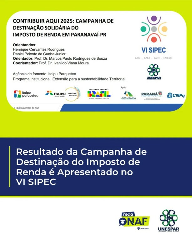 • O trabalho “ContribuIR Aqui 2025: Campanha de Destinação Solidária do Imposto de Renda em Paranavaí-PR” foi apresentado no VI SIPEC