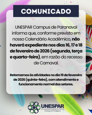 A Universidade Estadual do Paraná, Campus de Paranavaí informa que, conforme previsto em nosso Calendário Acadêmico, não haverá expediente nos dias 16, 17 e 18 de fevereiro de 2026 (segunda, terça e quarta-feira), em razão do recesso de Carnaval.