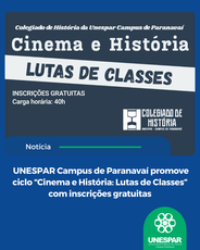O Colegiado de História da UNESPAR Campus de Paranavaí está com inscrições abertas para o ciclo “Cinema e História: Lutas de Classes”, que será realizado entre os dias 20 de junho e 12 de setembro de 2026. A proposta reúne uma série de encontros voltados à análise crítica de obras cinematográficas que abordam conflitos sociais, disputas políticas e processos históricos marcantes.